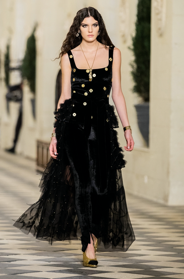 This is probably my favorite look in the collection. I love the rounded square neckline of the top of the gown. If you look closely you can see gold metal appliqués sewn to the top that resemble previous Chanel buttons. The bottom of this outfit is a pair of black velvet pants that match the velvet in the top making me think this look is almost like a catsuit with the top and the bottoms connected with a tulle half skirt tied around the waist.