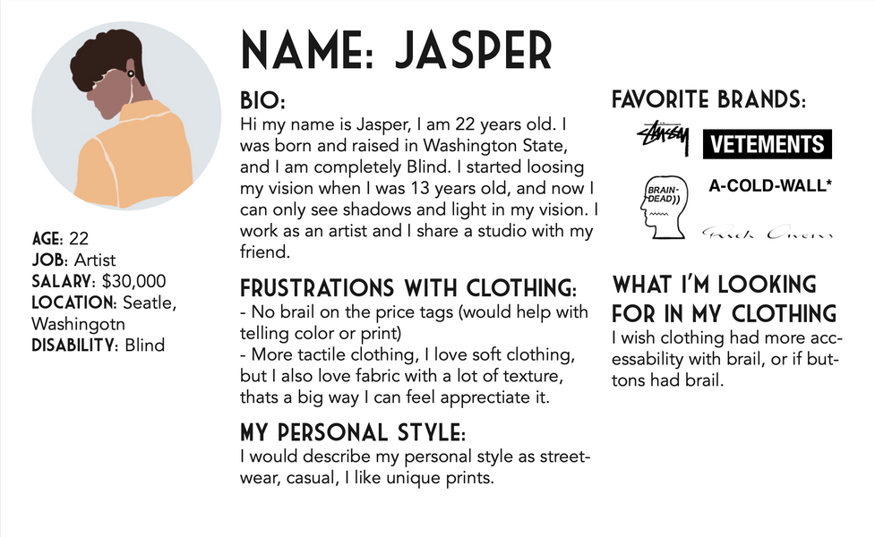 When reading through interviews, I really wanted to look at what these people felt like they were missing out on with their clothing. I wanted to make sure I knew exactly what adaptive needs needed to be met as well as Aesthetic wants.